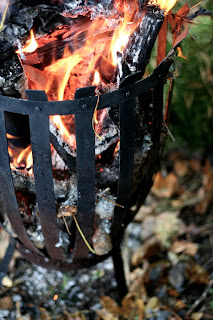 Vi firade in hösten med en brasa vid hönshuset.  Hönsen som går löst på tomten blev yra. Den svartaste hönan är kycklingen som jag skrev om här. Hon la sitt premiärägg igår! Annars surar dom, hönorna, just nu. Inga ägg på flera veckor. Grannen säger samma sak. Dom har tydligen semester.