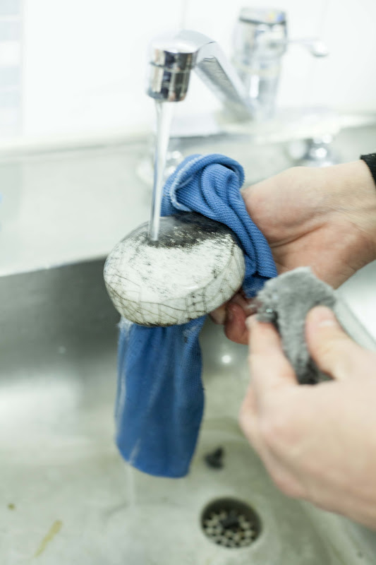 När godset svalnat en aning putsar man bort sotet med vatten och svinto. Ujuj vilken lycka det är att putsa fram krackeleringar.